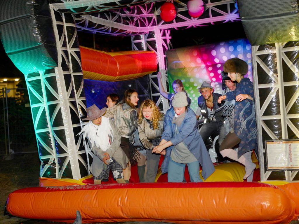 Ein Tanztheaterwalk durch eine Hüpfburgen-Stadt auf dem Leipziger Jahrtausendfeld.